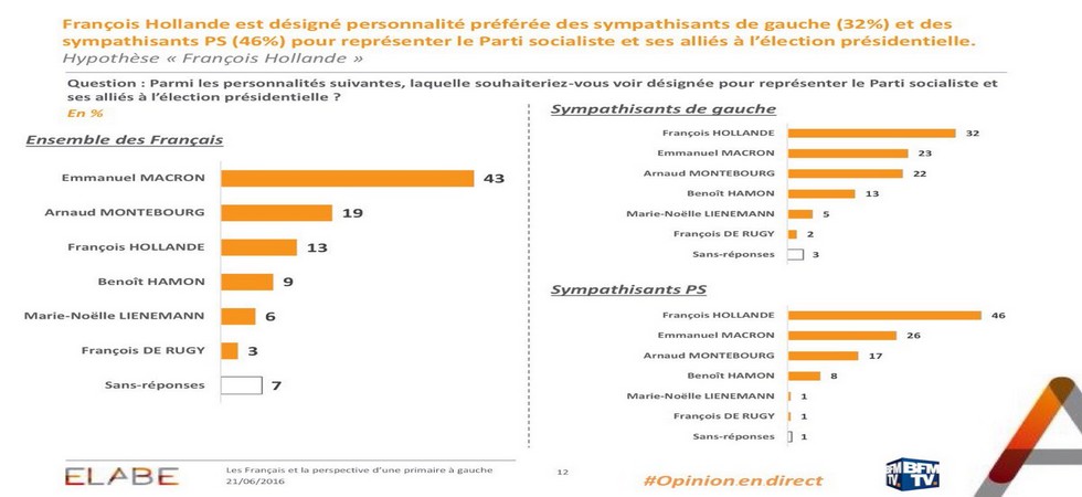 Dans l’hypothèse où le chef de l’État se présenterait à l’élection présidentielle de 2017 et à ce scrutin, rappelons qu’il a conditionné sa candidature à sa propre succession à l’inversion de la courbe du chômage, il serait plébiscité par un tiers des sympathisants de gauche (32%), devant son très populaire ministre de l’Économie Emmanuel Macron (23%) et Arnaud Montebourg (22%), qui laisse sous-entendre depuis plusieurs semaines qu’il pourrait être candidat. Les proches du PS préfèrent également une candidature de François Hollande (46%) à celles d’Emmanuel Macron (26%) et d’Arnaud Montebourg (17%). Benoît Hamon obtient 8% des préférences, alors que la sénatrice PS Marie-Noëlle Lienemann, qui a confirmé sa candidature, et l’écologiste François Rugy obtiennent chacun 1% des préférences.