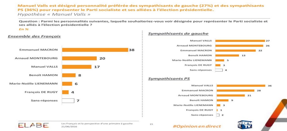 En revanche, l’actuel locataire de Bercy est le favori de l’ensemble des Français pour représenter l’ensemble du PS et ses alliés à l’élection présidentielle (43%), loin devant son prédécesseur Arnaud Montebourg (19%). François Hollande arrive en troisième position avec 13% de réponses positives. Si l’actuel président n’était pas candidat, les Français souhaiteraient voir Emmanuel Macron (38%) représenter le PS et ses alliés, devant Arnaud Montebourg (20%) et Manuel Valls (17%). Manuel Valls (27%) et Arnaud Montebourg (26%) seraient en revanche au coude à coude auprès des sympathisants de gauche, devant Emmanuel Macron (22%). L’actuel Premier ministre arrive en tête auprès des seuls proches du PS (36%), loin devant Emmanuel Macron (28%) et Arnaud Montebourg (21%).