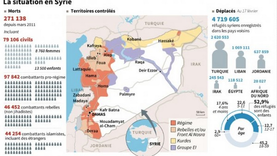 L’accord de cessation des hostilités ne concerne que les régions tenues par l’armée régulière et ses supplétifs ainsi que celles tenues par les groupes d’insurgés qui se sont engagés à respecter la trêve. Les jihadistes du groupe Etat islamique (EI) et du Front al-Nosra, branche syrienne d’Al-Qaïda, en sont exclus.
